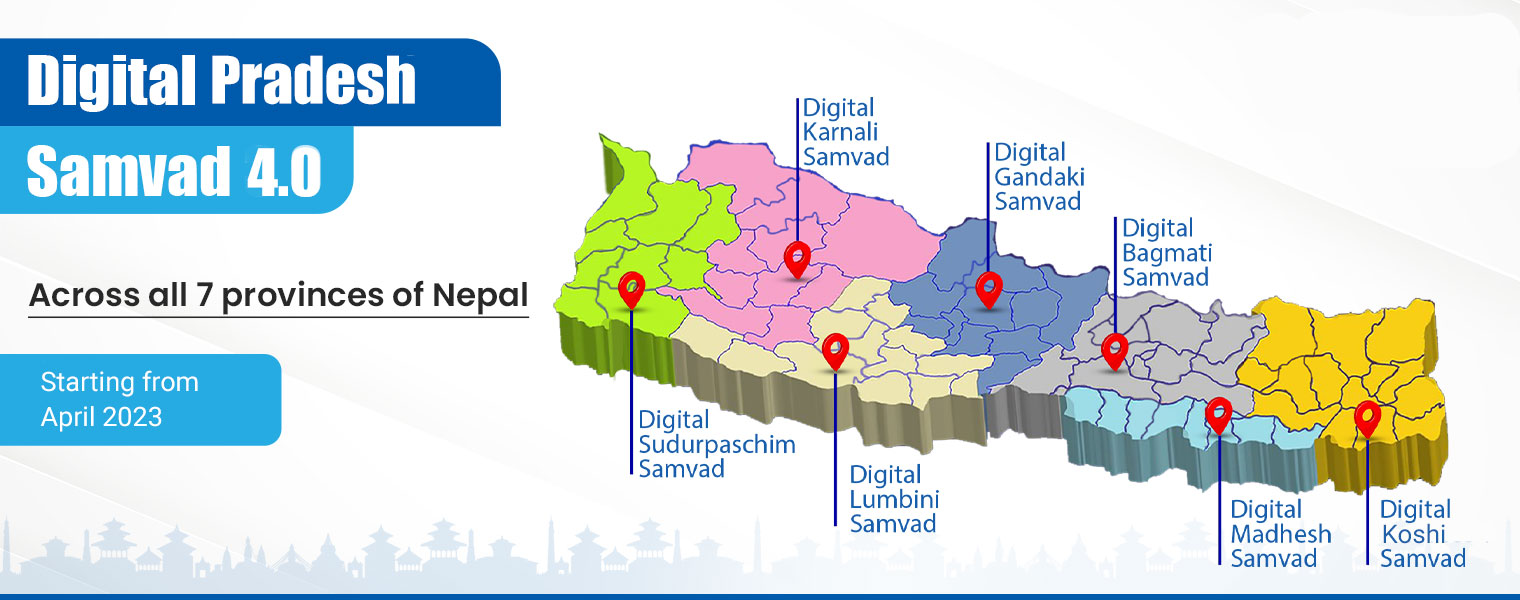 Following the success of the last three seasons of Digital Samvad, our team had come up with a fresh idea to begin the “Digital Pradesh Samvad ” in 2022. With the aim of collaborating with the local governments and officials with the public participating physically and virtually ,the samvad will be hosted in all seven provinces of the country with active participation from local governments and residents in each area where the Samvad is intended to address Information and technology-related challenges in local, private, and governmental sectors this year too.