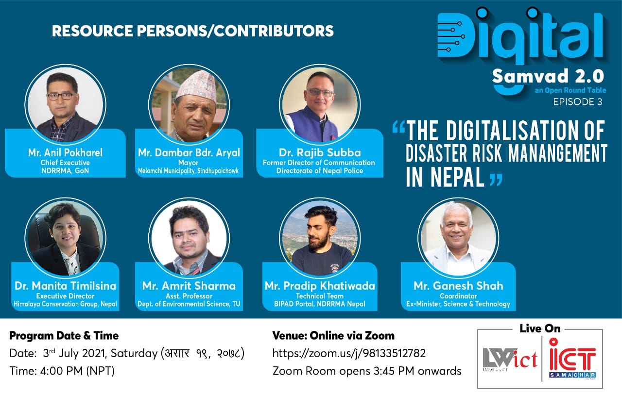 The first episode of the Digital Samvad 2.0 program was held on Saturday dated 2078/01/25 on the topic of “Nagarik App – Preparing Nepal for Digital Nepal”. The dialogue was conducted in the presence of Former Minister Mr. Ganesh Shah along with key resource persons, Joint Secretary, Ministry of Communication and Information Technology, Mr. Anil Kumar Dutt; Chief of Chakraghatta Municipality, Sarlahi, Mr. Bikram Yadav, CAN Federation President Mr. Nawaraj Kunwar, and Youth Representative Celsya Chhetri. The first episode of Digital Samvad 2.0 was conducted using the ZOOM application. Apart from the keynote speakers, there were representatives of various ministries, authorities, and departments under the Government of Nepal. Similarly, the Managing Director of Nepal Telecom, former chairpersons of CAN Federation, representatives of state and local governments, and representatives of district administration offices also had direct participation in the program. The dialogue was also broadcasted live through 4 different Facebook pages including Living with ICT. The program has been watched by more than 10,000 people so far. There were more than 150 direct participants in ZOOM. Program Coordinator and former Minister Mr. Ganesh Shah said, the Nagarik app is an important platform of Digital Nepal for the government services and facilities of Nepal and stressed the need to work together for its implementation. He suggested that the public should be made aware of this app so that the citizens can directly benefit from it and move towards making it more effective in the coming days. Asgar Ali, IT Advisor to the Prime Minister, the key resource person of the program, informed that 80 more new services will be added to the Nagarik app which was unveiled as a full version on ICT Day 2021 within six months. The concept note was introduced 3 years ago. According to him, most of the government payments will be made from this app within six months and services will be added to the citizen app in three different phases. Ali said that more than 13 million people could avail of the services if the government services were provided in technology. He said that the citizen app was developed under the Ministry of Communication and Information Technology as per the directive of good governance and the app’s hosting and technical support is being provided by the team of the National Information Technology Center. Speaking on the occasion, he expressed his commitment to do the work at the state and local level from the citizen app and said that a big transformation can be made in government service delivery through this app. He said that the data of the app will be kept safe as security has been checked by three different agencies. Informing that the guideline of Nagarik app that does not cost money to operate is being passed, Joint Secretary Anil Dutt said that digital Nepal framework will be promoted, the internet will be provided to rural and government offices as well as schools, 5G will be tested and SIM card will be distributed free of cost. He said that the government is doing such things. He also said that the ministry is ready to provide 24 hours service by preparing more than 40 manpower as soon as the directive is passed. Speaking on the dialogue, Dutta said that more than 200,000 downloaded by 625,000 people have been verified so far. He said that some works have been delayed due to the need to get approval from various agencies for the work. He also informed that 9 services have come in the app and the work has been taken forward by adding more services on the 19th of Baisakh. “The government has tried many things through the one-window system. This is an effort,” said Nawaraj Kunwar. He suggested that the government of Nepal should extend the infrastructure to every rural body in the country and provide services not only to those who now have access to the internet and smartphones but also to those who do not have access. Kunwar expressed his commitment to developing technology-friendly manpower by advancing digital literacy and for which CAN Federation would work together. Speaking on the occasion, Celsya Chhetri said that there were problems with long queues and other documents while availing government services, but it is good that the app was trying to solve it. She warned the government that if we do not move forward with digitalization efforts, we may fall behind. She said that there are many parts of the improvement, adding that other services should be added to the app and its use should be increased by raising awareness. She also stressed the need to create strategic teams and address them from the grassroots. According to Asgar Ali, IT advisor to the Prime Minister, most of the government payments will be made through this app within six months. Giving a presentation at the program, he informed that the system of paying transport tax under Bagmati Pradesh will be started soon. Ali also said that all the facilities from drinking water, financial, annual tax payments, and other government services will be provided through this app. Similarly, for the convenience of the students, Tribhuvan University and Kathmandu University will also be connected to the app soon and arrangements have been made to open a bank account from the Nagarik app itself. This report, prepared from the first episode of Digital Samvad 2.0 on “Nagarik App – Preparing Nepal for Digital Nepal”, covers all aspects of the program, including pre-program documents, highlights, and post-program highlights. The concept of the program, the outline of the program, the invitation sent to attend the program are presented in the first section of the report. The second section of the report contains a summary of the program, slides of presentations, banners and glimpses of the main program, some glimpses of live broadcast pages, questions and suggestions from the participants as well as the main highlights of the pro